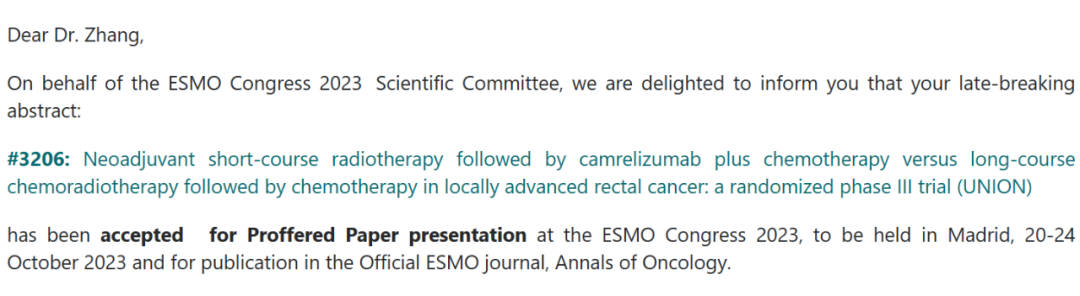 新辅助短程放疗序贯卡瑞利珠单抗联合化疗对比长程放化疗序贯化疗治疗局部晚期直肠癌的一项随机对照Ⅲ期研究(UNION)入选2023 ESMO proffered paper presentation