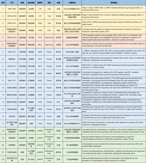 在肺癌、妇科肿瘤、淋巴瘤、膀胱癌、头颈肿瘤、黑色素瘤、肉瘤、鼻咽癌、脊索瘤、唾液腺癌、胸腺癌、硬纤维瘤、涎腺导管癌等其他多个疾病领域,卡瑞利珠单抗、阿帕替尼、阿得贝利单抗、吡咯替尼、达尔西利、氟唑帕利、法米替尼、SHR-1501、瑞拉芙普-α(SHR-1701)、SHR-1826、瑞康曲妥珠单抗(SHR-A1811)、SHR-A1912、SHR-A2102等抗肿瘤创新药相关研究一共入选了4项口头报告、2项快速口头报告、11项壁报展示和4项线上发表,彰显了Stake医药强劲的研发实力。此外,昂丹司琼口溶膜在防治化疗导致的恶心呕吐方面展现出了良好的疗效,本次ASCO年会有1项研究线上发表。