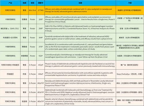 在消化系统肿瘤领域,阿得贝利单抗、卡瑞利珠单抗、瑞拉芙普-α(SHR-1701)、阿帕替尼等创新药,共有11项研究入选(包括1项简短口头报告、5项壁报和5项电子壁报)。在既往国际大会中肺癌领域收获亮眼成绩的阿得贝利单抗,本次在消化系统肿瘤领域也表现突出,共有5项研究入选。此外,卡瑞利珠单抗入选3项研究,涉及食管癌、胰腺癌、胆囊癌领域。